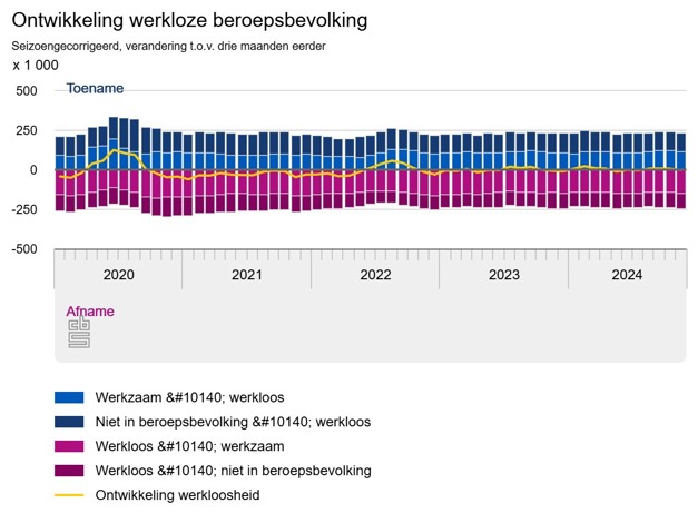 In november 2024 waren er 372 duizend werklozen. Dit is 3,7 procent van de beroepsbevolking, net als in de drie maanden ervoor. Het aantal mensen met betaald werk steeg de afgelopen drie maanden met gemiddeld 8 duizend per maand en bedroeg 9,8 miljoen in november. Dit meldt het CBS op basis van nieuwe cijfers. UWV registreerde eind november 177 duizend lopende WW-uitkeringen.