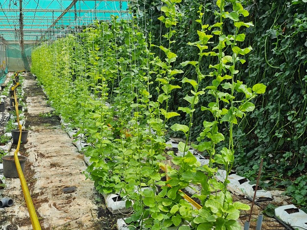 De constant hoge temperatuur van rond de 33 graden is de grootste uitdaging in de teelt. "Ook het irrigatiewater warmt overdag flink op zodat we de planten bij voorkeur 's ochtends vroeg en 's avonds laat bewateren. Ook overdag wordt geïrrigeerd, maar dan moet er continu rekening worden gehouden met de temperatuur van het water", aldus Adrian. "Op het midden van de dag gaan de bladeren van de komkommer helemaal slap staan, 's avonds trekken ze dan weer bij. Water koelen doen we niet en we hebben ook geen ventilatoren hangen in de kas, want dan zit je met de kosten van elektriciteit. De wind die door de kas waait, zorgt voor de nodige afkoeling."
