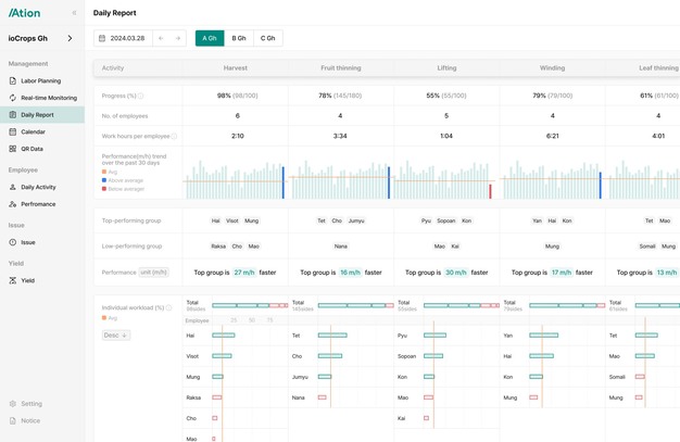 Werknemers scannen QR-codes om hun taken te registreren, waardoor managers de voortgang in realtime kunnen volgen en taakgegevens kunnen analyseren. Door het digitaliseren en visualiseren van statistieken zoals taakvolume, werkuren en werksnelheid, identificeert Ation inefficiënties, waardoor telers meer kunnen bereiken met dezelfde arbeidskrachten terwijl onnodige verspilling van arbeid wordt tegengegaan. "Arbeidskosten zijn een belangrijke kostenpost voor teeltbedrijven en Ation helpt de efficiëntie te verbeteren door werkverlies te beperken en de productiviteit te verhogen", voegt JinHyung toe.