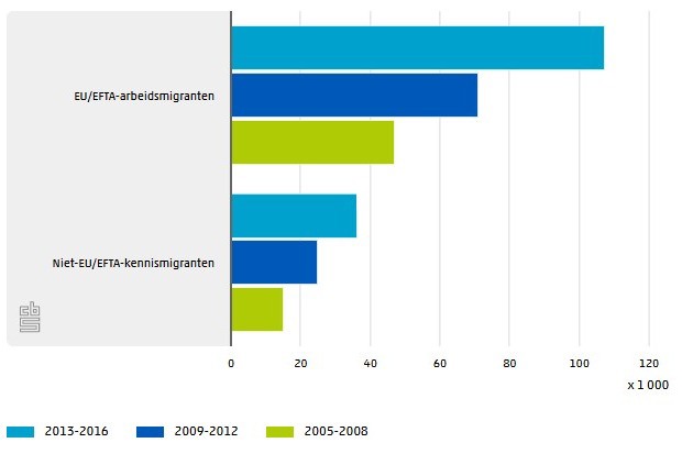 Tussen 2005 en 2016 kwamen 225 duizend arbeidsmigranten uit de EU/EFTA en 76 duizend kennismigranten van buiten de EU/EFTA naar Nederland. Dat is 22 procent van de totale immigratie van mensen met een niet-Nederlandse nationaliteit. In de periode 2013 tot 2016 kwamen 107,3 duizend arbeidsmigranten uit de EU/EFTA naar Nederland. Dit is meer dan twee keer zo veel als tussen 2005 en 2008. Het aantal kennismigranten van buiten de EU/EFTA steeg van 15,1 duizend tussen 2005-2008 naar 36,3 duizend tussen 2013-2016.