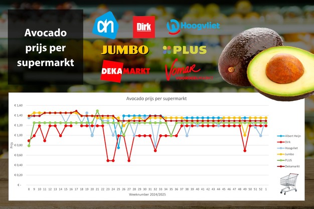 Weinig verschuivingen in de avocadoprijzen in week 1 van het 2025. Over het algemeen zijn de prijzen gelijkgebleven. Alleen bij Hoogvliet is de aanbieding van 99 eurocent voorbij en is er gelijk een prijsstijging ingezet naar 1,35 euro.