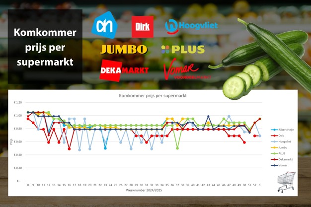 Hoogvliet doet de komkommers in de aanbieding in week 1 voor 69 eurocent. Daarentegen zetten de meeste andere supermarkten een prijsverhoging in naar 95 eurocent. Dit geldt voor zowel Albert Heijn, Jumbo, Plus en DekaMarkt. Alleen bij Dirk blijven de prijzen gelijk.