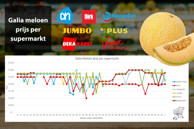 Flinke verschuivingen in de prijzen van Galia meloen. Na de aanbieding van vorige week bij Albert Heijn is de prijs voor Galia meloen weer terug op 2,79 eurocent. Hoogvliet en Plus zetten de Galia meloen daarentegen juist in de aanbieding in week 1 voor respectievelijk 2,29 en 2,24 euro. DekaMarkt verhoogt de prijs juist naar 2,79 eurocent.