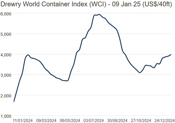 De vrachtkosten van New York naar Rotterdam en Rotterdam naar New York daalden met 1% tot respectievelijk $719, $828 en $2.698 per 40ft container. De ILA en USMX hebben een voorlopig akkoord bereikt, waardoor een dreigende havenstaking in januari is afgewend. Desalniettemin verwacht Drewry dat de tarieven op de Transpacifische route de komende week zullen stijgen, gedreven door frontloading in de aanloop naar de verwachte tariefverhogingen onder de aankomende Trump-regering.
