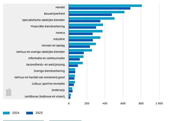 Absoluut gezien was de stijging van het aantal faillissementen het sterkst in de specialistische dienstverlening. In 2024 gingen hier 157 bedrijven en instellingen meer failliet dan in 2023. Vooral bij concernholdings, concerndiensten, managementadvies, architecten- en ingenieurs was het aantal faillissementen hoger dan een jaar eerder. Met een stijging van 139 faillissementen volgde de bouwnijverheid als tweede. De toename is vooral toe te schrijven aan de gespecialiseerde bouw (waaronder bouwinstallatie- en afwerkingsbedrijven). In de handel bedroeg de stijging 129. Dat betrof vooral groothandelsbedrijven.