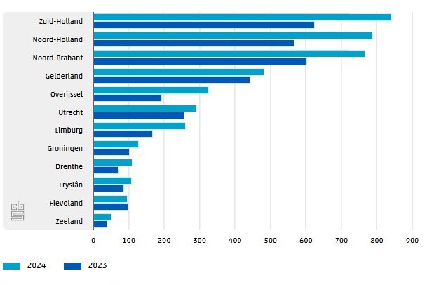 In vrijwel alle provincies zijn in 2024 meer bedrijven failliet verklaard dan in 2023. Het grootst was de stijging in Noord-Holland met 222 bedrijven. Daarna volgden Zuid-Holland en Noord-Brabant. De provincies Zuid-Holland, Noord-Holland en Noord-Brabant telden de meeste faillissementen, maar ook de meeste bedrijven.