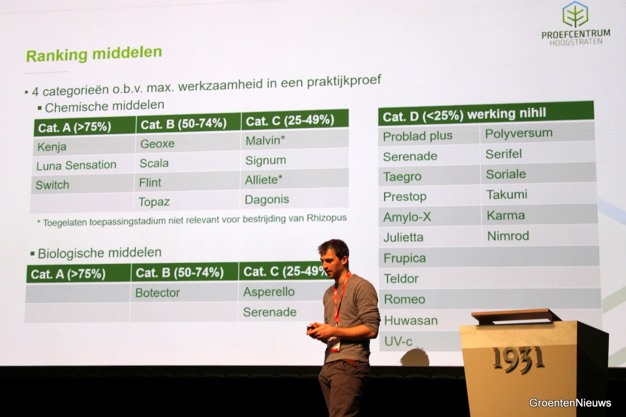 Enkele middelen komen in het onderzoek als 'sterk' werkend naar voren. Botector blijkt van alle geteste middelen het best te werken. De chemische middelen Kenja, Geoxe en Switch, met toelatingen in Belgiƫ, vielen met hun werking ook op. Typerend voor het krimpende middelenpakket waarmee telers te maken hebben is dat Geoxe alweer uit het middelenpakket gaat verdwijnen, zoals direct na de presentatie van Maarten live op het podium werd gedeeld.