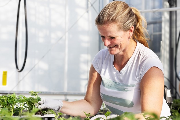 Monique Bijlaard van de WUR bij het verpotten van de tomatenplanten, in aanloop naar de teeltwedstrijd. Donderdagmiddag vertelde Monique namens de referentietelers veel lol te hebben gehad bij het zien van de planten uit de kas. Die waren niet allemaal even fraai, en soms vielen ze, topzwaar als ze waren, ook om. "Aan de planten kon je goed zien wat er in de kas gebeurde."