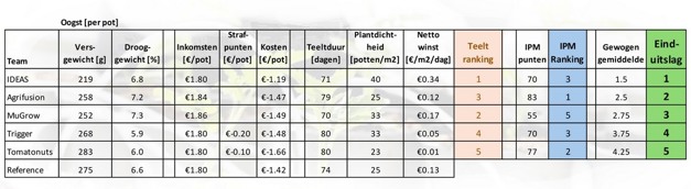 Het winnende team, team IDEAS met een afvaardiging van Zhejiang University uit China, durfde de meeste potten per vierkante meter in het kascompartiment te zetten. Met 40 potten per vierkante meter realiseerde dit team de hoogste netto-omzet. De all-or-nothing-strategie van dit team pakte goed uit.