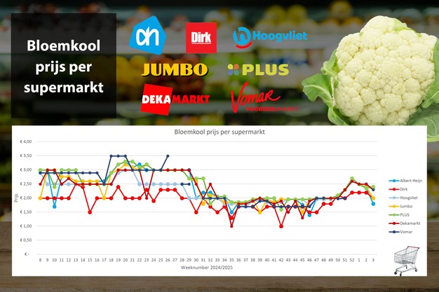 De dalende trend In de bloemkool blijft doorzetten. In week 3 wederom prijsverlagingen (tussen de 2 en 9%), en forse aanbiedingen bij Albert Heijn (-24%), en Jumbo (-17%). Prijs verschillen met begin 2024 zijn flink (tussen de 20 en 30%).