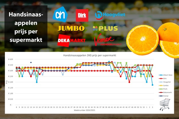 In week 3 Albert Heijn zet handsinaasappelen flink in de kijker met een aanbieding van 50%, Dirk doet het rustiger aan en haalt 50 cent van de prijs af die dan uitkomt op € 2,49. Bij Albert Heijn kost een netje handsinaasappelen van 2 kg in week 3 € 1,75. Prijzen bij de andere supermarkten liggen rond de € 3,50. Dat is 6 tot 9% hoger dan in week 3 van 2024.