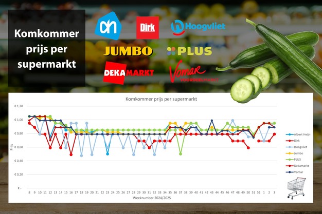 In week 3 stijgen de komkommerprijzen bij Dirk en Hoogvliet. Hoogvliet sluit aan bij de prijs van de meeste andere supermarkten, namelijk 95 cent per stuk. Dirk verhoogt naar 79 cent per stuk. Opvallend is dat DekaMarkt de prijs verlaagt van 95 naar 89 cent. Van inflatie is overigens geen sprake, want de komkommer prijzen liggen 11 tot 18 procent lager dan begin 2024.