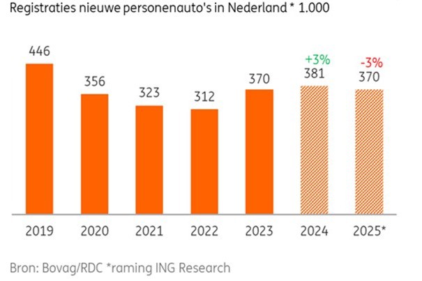 Na een kleine plus in 2024 zal de Nederlandse verkoop van nieuwe auto's in 2025 naar verwachting weer iets terugvallen van 381.000 naar 370.000 (-3%). Tweederde van de nieuwe auto's komt van bedrijven en zij hebben minder auto's van de coronageneratie (2020 e.v.) te vervangen. Dit wordt niet gecompenseerd door uitbreiding van de wagenparken bij zakelijke dienstverleners en particulieren vinden het aanbod met gestegen nieuwprijzen vaak te duur.