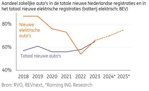 Nu ze moeten gaan rapporteren over emissies van zakelijk verkeer (CSRD-richtlijn) voelen zij extra druk om door te gaan met vergroenen van hun wagenpark. Eerder heeft een reeks ambitieuze werkgevers zich ook gecommitteerd aan een fossielvrij wagenpark in 2025. Bij grote bedrijven (>1.000 medewerkers) wordt elektrisch in de helft van regelingen in leaseregelingen al verplicht gesteld aan medewerkers. Ook zullen eind 2025 naar verwachting extra veel elektrische auto's op kenteken worden gezet doordat de bijtelling in 2026 naar het normale tarief wordt verhoogd (van 17% naar 22%) en de korting dan volledig vervalt. Rico Luman, Sectoreconoom automotive: "Aangezien het zakelijke aandeel in de nieuwverkoop naar verwachting boven de 70% uitkomt, groeit het verwachte aandeel elektrisch in de nieuwverkoop ondanks wegblijven van particulieren naar bijna 39% (van 35% in 2024)".