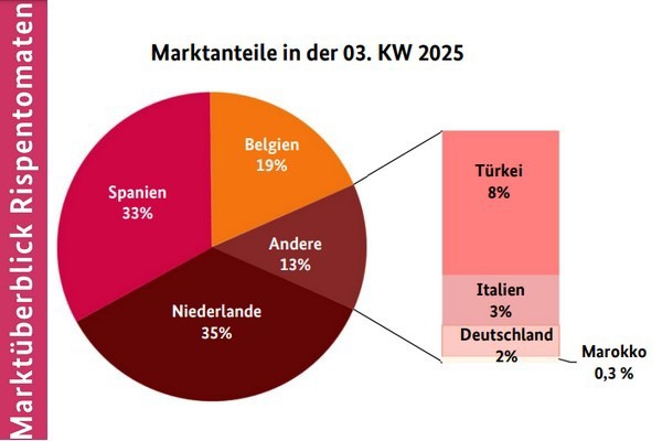 De trostomaten kwamen hoofdzakelijk uit Nederland en Spanje, met België op de derde plaats qua aanbod. Cherrytomaten werden voornamelijk aangevoerd uit Spanje en Italië. Volgens het BLE was het merendeel van de ronde tomaten afkomstig uit Marokko en Turkije. In het segment van de vleestomaten gaven vooral Marokkaanse en Spaanse partijen de toon aan. Klanten hadden toegang tot een zeer gevarieerd aanbod, waarbij de kwaliteit in het algemeen uitstekend was. De vraag was soms behoorlijk sterk, maar kon zonder moeite worden ingevuld. De prijzen vertoonden weinig schommelingen; hoewel er gedurende de week prijsstijgingen werden waargenomen, werden deze tegen het weekend vaak weer gematigd, aangezien handelaren hun prijzen verlaagden om overschotten te vermijden.