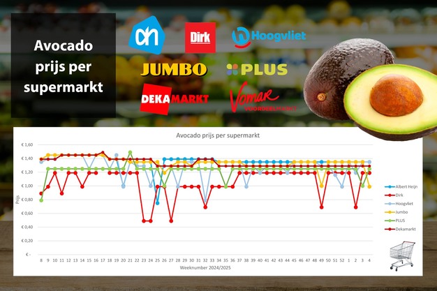 Prijsdata zijn afkomstig van Supermarktscanner.nl en gebaseerd op de online prijzen in de webwinkels van Albert Heijn, Jumbo, Plus, DekaMarkt, Dirk en Hoogvliet. De prijs is een gemiddelde, inclusief de promoties. In deze prijsvergelijking zijn herkomst en kwaliteit niet meegenomen. De meeste supermarkten vermelden deze gegevens niet op hun website, Hoogvliet en Jumbo vermelden het land van herkomst. Mogelijk worden in de bovenstaande prijsvergelijking onrijpe avocado's met rijpe vergeleken en Spaanse komkommers met Hollandse.