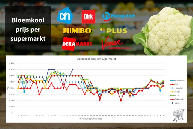 De dalende trend in de bloemkool is omgeslagen naar prijsverhogingen door alle gevolgde supermarkten in de AGF-monitor. Dirk blijft met € 2,19 de goedkoopste, terwijl Albert Heijn en Plus het duurst zijn (€ 2,59). Ten opzichte van de bloemkoolprijs in week 4 in 2024, liggen de prijzen tussen de 12 en 20% lager.