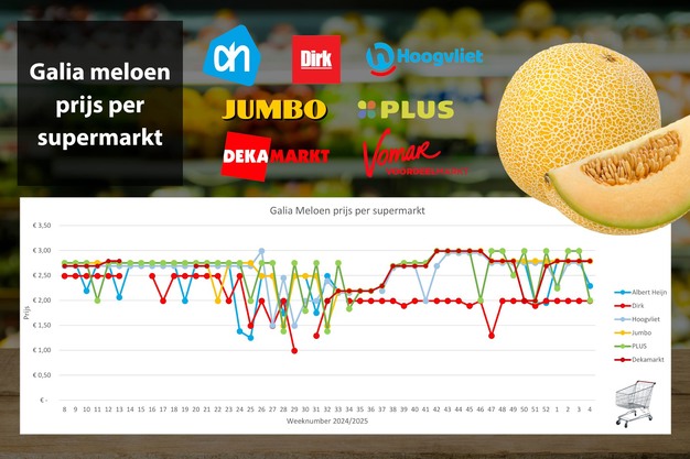 Na een aantal stabiele weken in het meloenschap, staan in week 4 Galia meloenen bij Albert Heijn en Plus in de schijnwerpers met aanbiedingen van respectievelijk 18% en 33%. Hoogvliet voert een lichte prijsverhoging door van 4 eurocent. Dirk houdt de prijs flink lager dan de andere supermarkten en ook vergeleken met de prijs die ze begin 2024 voerden (€ 2,49, nu € 1,99)
