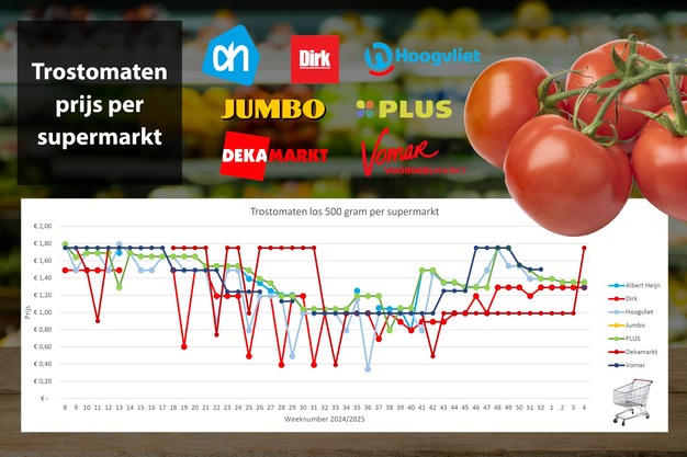 DekaMarkt voert een enorme prijsstijging door bij losse trostomaten 500 g. Vanaf week 32 in 2024 tot en met week 3 in 2025 kostten deze 99 cent, maar in week 4 van 2025 verhogen ze de prijs naar € 1,75, dezelfde prijs als in week 31 van 2024. De andere supermarkten houden de prijzen stabiel, deze liggen tussen € 1,29 en € 1,35.