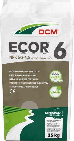 "Dankzij de CE-markering kan ECOR 6 moeiteloos in de hele EU worden verkocht, zonder dat er extra grensdocumenten of etiketten nodig zijn (behalve voor talen die niet op de verpakking staan). Bovendien is ECOR 6 nu geschikt voor de productie van CE-gecertificeerde potgronden in de categorie CE PFC 7 (Bemestingsproductenblend). Een ander voordeel is dat ECOR 6 wordt geproduceerd met behulp van de unieke DCM MINIGRAN® technology en daarom wordt geleverd in de vorm van gebruiksvriendelijke, homogeen samengestelde minikorreltjes die bijdragen aan een uniforme groei en minder verliezen."