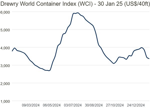 De World Container Index van Drewry daalde afgelopen week met 2% naar $3.364 per 40ft container. Dit is 68% lager dan de piek van $10.377 tijdens de pandemie in september 2021, maar nog 137% hoger dan het gemiddelde tarief van $1.420 in 2019.