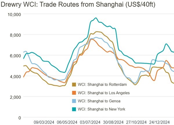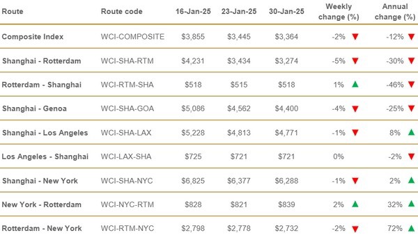 Vrachttarieven van Shanghai naar Rotterdam daalden met 5% of $160 naar $3.274 per 40ft container, terwijl die van Shanghai naar Genua met 4% of $162 daalden naar $4.400 per 40ft container. Evenzo daalden de tarieven van Rotterdam naar New York met 2% of $46 naar $2.732 per 40ft container, gevolgd door de tarieven van Shanghai naar New York en Shanghai naar Los Angeles, die met 1% daalden naar respectievelijk $6.288 en $4.771 per 40ft container.
