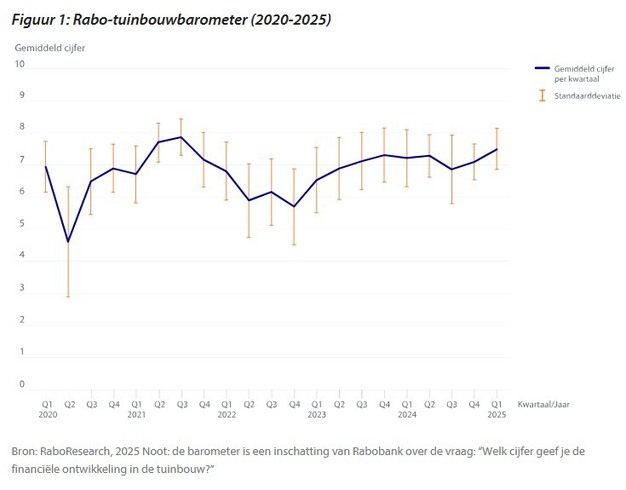De Rabo-barometer laat in het eerste kwartaal van 2025 een goed niveau zien, namelijk een 7,5. Bijna alle subsectoren van de tuinbouw boeken goede resultaten. Alleen groene kamerplanten en de champignonteelt voor de verwerkende industrie doen het minder goed. Bekijk in figuur 1 het verloop van de Rabo-tuinbouwbarometer van 2020 tot nu.