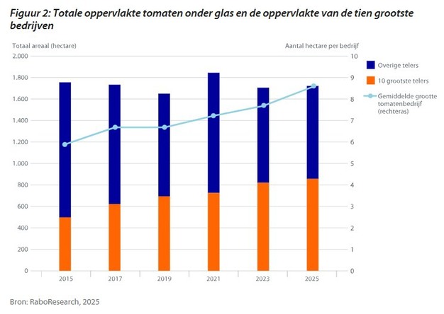 Het voorbeeld van tomaat laat deze beweging goed zien (zie figuur 2). Het areaal tomaten onder glas bleef de afgelopen tien jaar schommelen rond 1.700 hectare. Tien jaar geleden was het aandeel van de tien grootste bedrijven ongeveer 500 hectare (~30%). Nu is de (Nederlandse) oppervlakte van de tien grootste bedrijven gestegen naar circa 850 hectare, waarmee ongeveer 50% van het areaal bij de tien grootste bedrijven staat. De overige 200 bedrijven hebben ook zo'n 850 hectare. Het gemiddelde areaal laat daarom vooral de schaalvergroting zien van de grootste tien bedrijven. De trend van samenvoeging van bedrijven door fusies of overnames is ook in 2024 onverminderd doorgegaan.