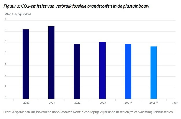 Als er 4% minder aardgas wordt gebruikt, betekent het dat de CO2-emissie van fossiele brandstoffen in de glastuinbouw in 2024 ongeveer 4,9 megaton is. Daarboven komen nog overige emissies in de glastuinbouw voor onder andere groeimedia en meststoffen. Voor 2025 verwachten we dat de uitstoot weer met 3 tot 5% daalt, op basis van de volgende ontwikkelingen: