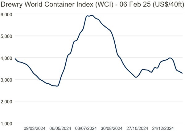 De World Container Index van Drewry daalde afgelopen week met 3% naar $3.273 per 40ft container. Dit is 68% lager dan de piek van $10.377 tijdens de pandemie in september 2021, maar nog 130% hoger dan het gemiddelde tarief van $1.420 in 2019.