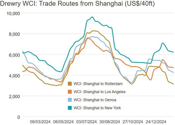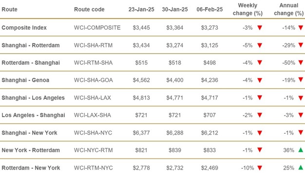 Vrachttarieven van Rotterdam naar New York daalden met 10% of $263 naar $2.469 per 40ft container, terwijl die van Shanghai naar Rotterdam daalden met 5% of $149 naar $3.125 per 40ft container. De tarieven van Rotterdam naar Sjanghai en Sjanghai naar Genua daalden met 4% tot respectievelijk $498 en $4.236 per 40ft container. De tarieven van Los Angeles naar Sjanghai daalden met 2% of $14 tot $707 per 40ft container.