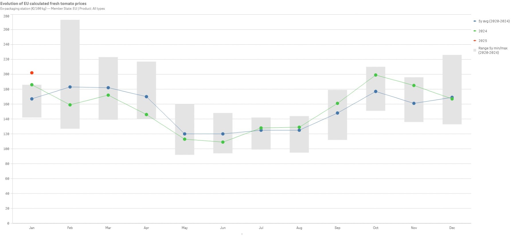 In Spanje lagen de prijzen wel hoger, voor alle segmenten. Behalve rode cijfers in Nederland noteert ook Italiƫ rode cijfers, voor trostomaten. De prijzen blijven hier 15% achter bij januari 2024.