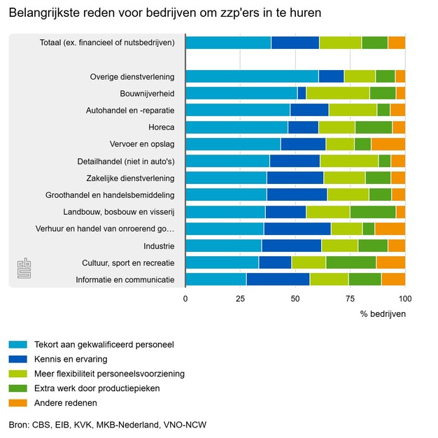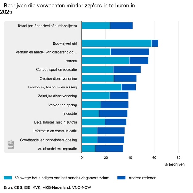 Ruim 42 procent van de bedrijven die in 2024 zzp'ers inhuurden, verwacht dat in 2025 minder te doen. Volgens de bedrijven speelt de aangekondigde strengere controle op schijnzelfstandigheid een belangrijke rol. Tegelijkertijd is een tekort aan gekwalificeerd personeel de belangrijkste reden om zzp'ers toch in te huren. Dit meldt het CBS op basis van de Conjunctuurenquête Nederland van januari 2025, die wordt gehouden in samenwerking met KvK, EIB, MKB-Nederland en VNO-NCW.