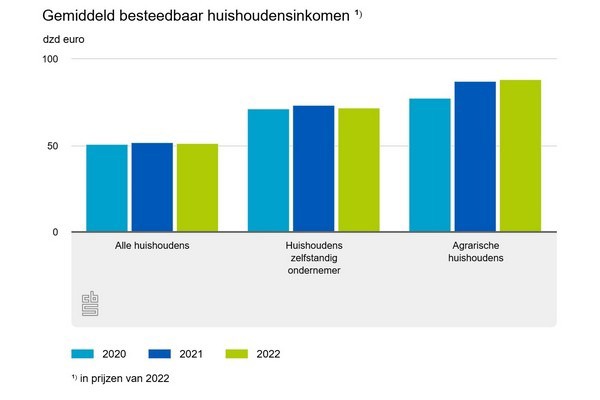 Agrarische huishoudens hadden in 2022 een gemiddeld besteedbaar inkomen van 88,2 duizend euro. Dit is meer dan het gemiddelde van alle huishoudens in Nederland (51,2 duizend euro per jaar), en dat van huishoudens van zelfstandig ondernemers (71,8 duizend euro).