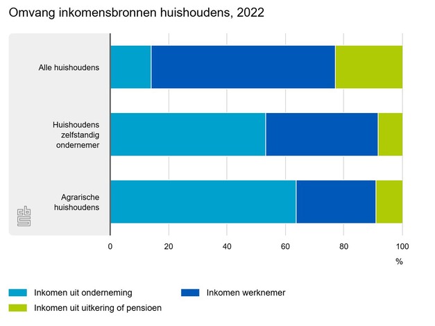 Voor huishoudens van zelfstandig ondernemers werd 53 procent van het inkomen verdiend uit de onderneming, 38 procent uit loon en werd 8 procent ontvangen uit uitkering of pensioen.