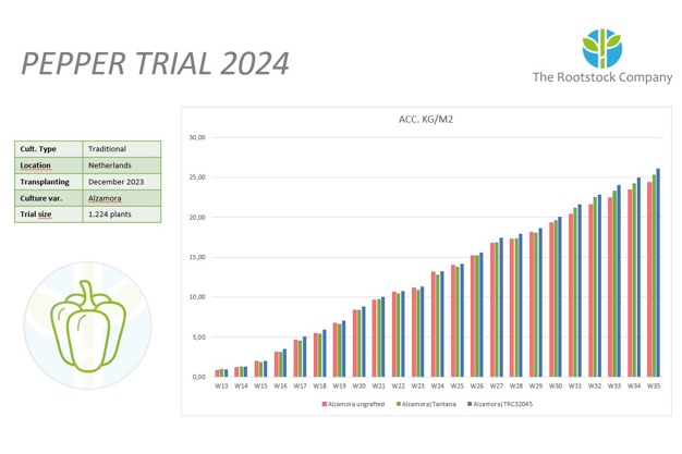 Op dit moment valt vanuit nieuwe genetica onderstam TRC32045 volgens de Commercieel Manager het meeste op in de conventionele paprikateelt. "Dit ras heeft beduidend andere eigenschappen dan Taritana, onze onderstam die het goed doet in de bioteelt. TRC32045 is groeikrachtiger en heeft vorig jaar bijvoorbeeld meegedraaid in onderzoek bij een proeftuin in België en bij een Nederlandse teler (zie grafiek). De vraag is nu welke onderstam met welke eigenschappen het beste aansluit op de gangbare cultuurrassen."
