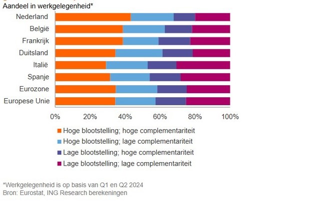 Nederland heeft een groter AI-potentieel dan omliggende landen. Hier kan 43% van de banen AI als aanvulling gebruiken, tegenover 39% in België en Frankrijk en 35% in Duitsland. De hoogopgeleide diensteneconomie biedt daarmee gunstige omstandigheden voor AI-adoptie. In Zuid-Europa, waar werkloosheid hoger is en minder banen door AI worden beïnvloed, kan de impact op de arbeidsmarkt groter en disruptiever zijn.