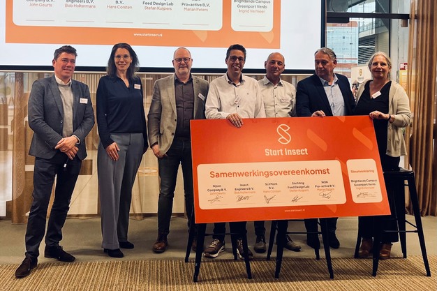 Vlnr: Willem van Hoof (Bluehub), Ingrid Vermeer (Brightlands Campus Greenport Venlo), Stefan Kuijpers (Feed Design Lab), Bob Holtermans (Insect Engineers), Karel van der Velden (Nijsen company), Hans Corsten (namens Fieldlab Circulair verdienen met insecten in de Peel) en Marian Peters (NGN Pro-active)