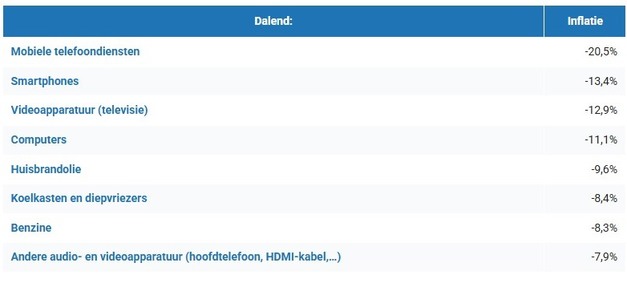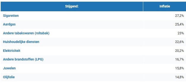 De prijs van fruit steeg deze maand gemiddeld met 5,6%. Suikerwaren zijn gemiddeld 4,3% duurder. Vakantiedorpen stijgen met 5,8%. De prijs van aardgas steeg met 0,9%. De prijzen voor citytrips stegen gemiddeld met 1,4%. Brood en granen werden gemiddeld 1,0% duurder ten opzichte van vorige maand.