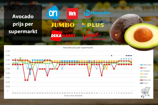 Prijsdata zijn afkomstig van Supermarktscanner.nl en gebaseerd op de online prijzen in de webwinkels van Albert Heijn, Jumbo, Plus, DekaMarkt, Dirk en Hoogvliet. De prijs is een gemiddelde, inclusief de promoties. In deze prijsvergelijking zijn herkomst en kwaliteit niet meegenomen. De meeste supermarkten vermelden deze gegevens niet op hun website, Hoogvliet en Jumbo vermelden het land van herkomst. Mogelijk worden in de bovenstaande prijsvergelijking onrijpe avocado's met rijpe vergeleken en Spaanse komkommers met Hollandse.