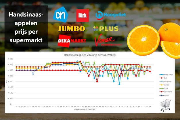 Buiten een kleine aanbieding van Dirk (-3%) voeren de supermarkten in week 14 geen prijswijzigingen door in handsinaasappelen.