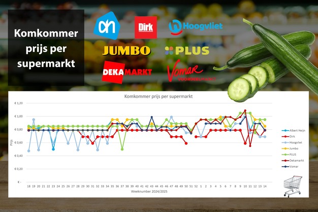 De forse komkommeraanbieding van Hoogvliet (van 95 cent voor 69 cent per stuk) uit week 13 loopt in week 14 door. Verder zien we prijsverlagingen van 10 cent per stuk bij Albert Heijn, Jumbo, DekaMarkt en Vomar.