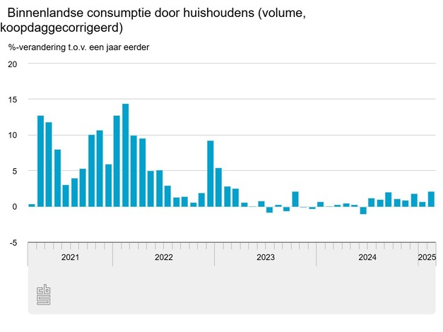In februari hebben huishoudens 2,1 procent meer geconsumeerd dan in februari 2024, meldt het CBS. Ze kochten zowel meer goederen als meer diensten.