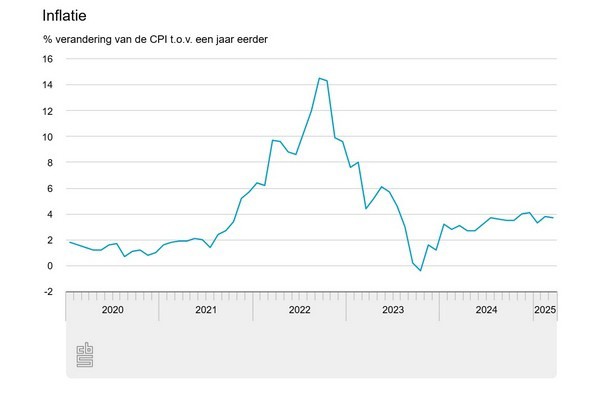 Consumentengoederen en -diensten waren in maart 3,7 procent duurder dan een jaar eerder, meldt het CBS. In februari was de inflatie 3,8 procent. Het inflatiecijfer van maart is hetzelfde als bij de snelle raming die op 1 april is gepubliceerd.