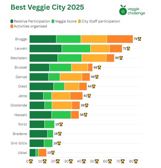 Brugge is de grote winnaar van de Veggie Challenge 2025 en mag zich een jaar lang Veggie Hoofdstad van het land noemen. Leuven, dat al drie keer de titel veroverde, eindigt dit jaar op een tweede plaats, met Mechelen als derde. KULeuven wint de scholenwedstrijd, zo meldt organisator ProVeg.