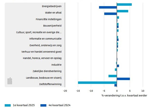 Volgens de eerste berekening van het CBS, op basis van nu beschikbare gegevens, steeg het bruto binnenlands product (bbp) in het eerste kwartaal van 2025 met 0,1 procent ten opzichte van het vierde kwartaal van 2024. De economische groei is de afgelopen vier kwartalen steeds kleiner geworden. De stijging van het bbp in het eerste kwartaal van 2025 is vooral toe te schrijven aan een kleinere afbouw van de voorraden dan een kwartaal eerder. Daarnaast droeg de consumptie door de overheid licht positief bij.