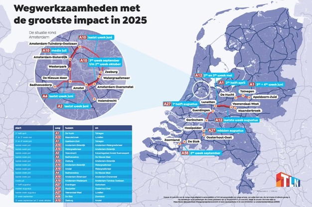 Informatievoorziening blijft een uitdaging. Rijkswaterstaat werkt lang van tevoren aan ruwe jaarplanningen, afgestemd met gemeenten, provincies en andere wegbeheerders. TLN ontvangt deze globale planningen vroegtijdig en deelt ze op hoofdlijnen met leden. Definitieve data worden echter vaak pas kort tevoren bekend. Specifiekere informatie is te vinden via bronnen als Rijkswaterstaat, VanAnaarBeter, Nationaal Dataportaal Wegverkeer (NDW) en regionale platforms zoals Zuid-Holland Bereikbaar. Poppink: 'Ons kaartje bij dit artikel geeft een indicatie van grote projecten, maar is nooit helemaal volledig. We laten gedetailleerde communicatie bewust bij de wegbeheerders.'