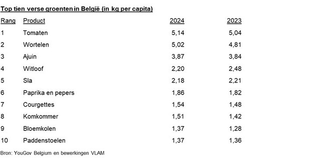 80% van de groenten in België wordt in verse vorm gekocht. De tomaat blijft de koploper binnen het verse groenteassortiment met 5,14 kg per capita op de voet gevolgd door wortelen met 5,02 kg per capita en op de derde plaats ajuin met 3,87 kg per capita. De kerstomaten blijven verder groeien en zijn goed voor 37% van het verkochte volume aan tomaten en 56% van de tomatenomzet.