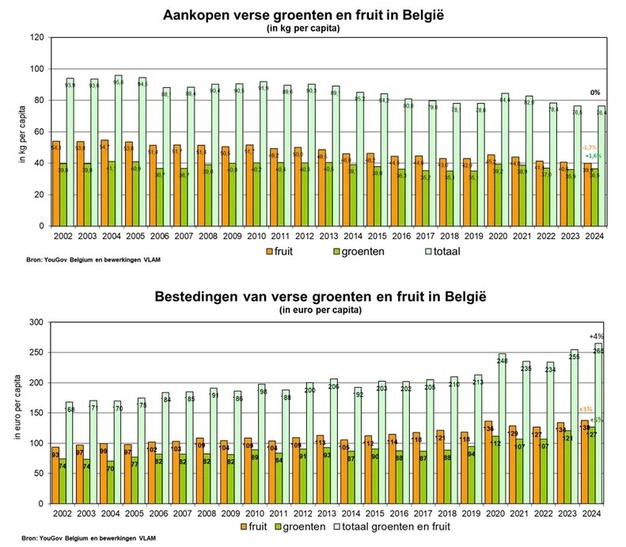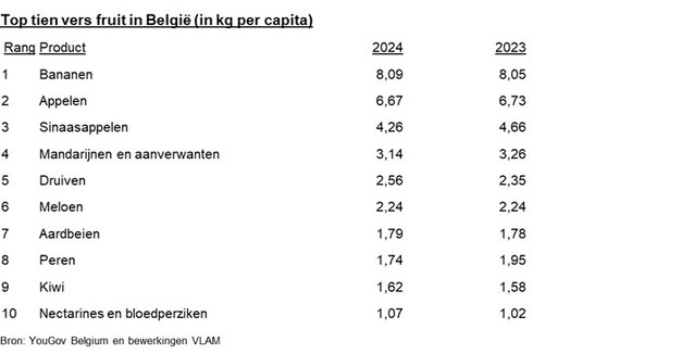 De banaan (8,09 kg per capita) blijft ook in 2024 de meest gekochte fruitsoort in België en is een stabiele nummer één. De appel (6,67 kg per capita) op nummer twee daalde met 1%. Jonagold blijft wel een stevige marktleider met 40% van de appelmarkt. Stijgers in de fruittoptien waren: druiven (+9%), nectarines (+5%), kiwi's (+3%) en aardbeien (+1%). De perenverkoop zet zijn dalende trend verder (-11% in 2024). Conference wordt in deze krimpende markt steeds dominanter en maakt nu 80% van de perenverkoop uit (in 2016 was dit aandeel nog 69%).