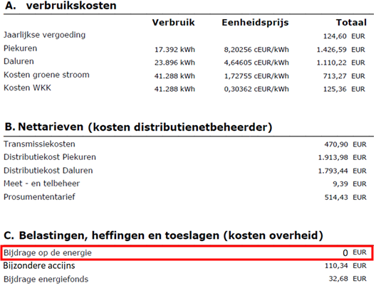 - Op de lijn "bijdrage op energie" of "energiebijdrage" staat het bedrag van 0 euro.